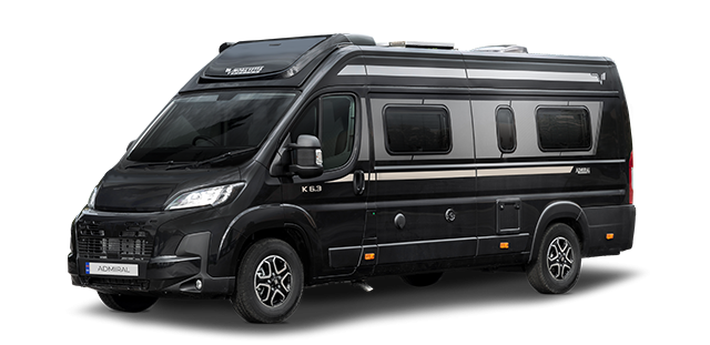 The Mobilvetta Admiral K6.3 new campervan is built on a Fiat chassis and comes with an automatic 140bhp engine with 2 berths and 4 travelling seats. The campervan layout includes two large single beds or one big double bed at the rear, a central kitchen and washroom, a front dinette and lounge area utilising the driver and passenger seats. Equipped with a Truma Combi 4 heating system, solar panel, 16” alloy wheels, cruise control and speed limiter, awning, winter pack and a comprehensive specification you're ready for year round touring.